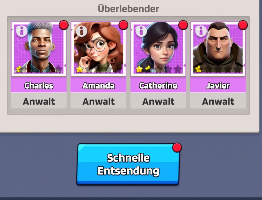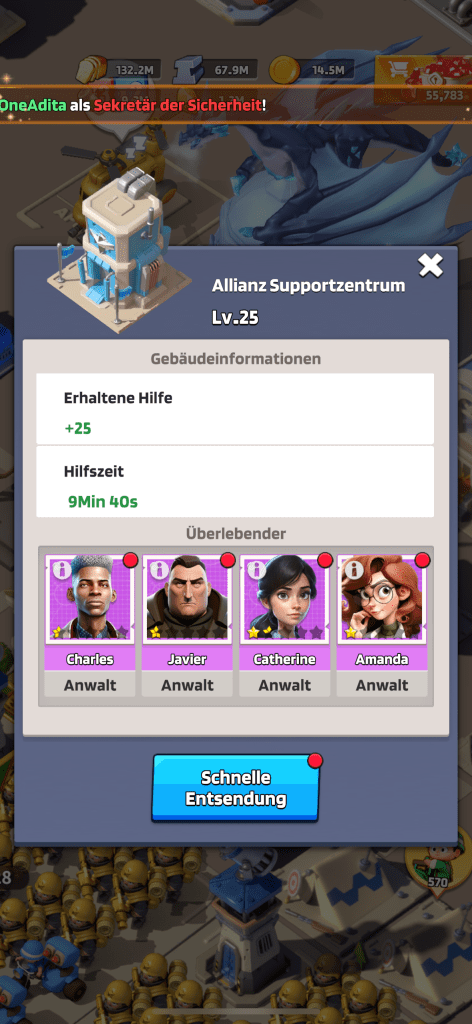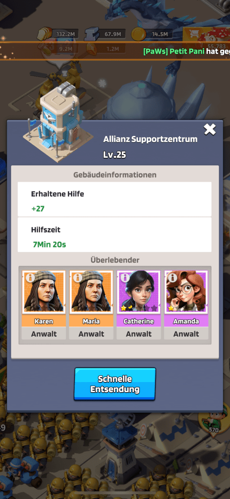 Der rote Punkt bedeutet, es gibt wahrscheinlich ein Upgrade, welches man ausführen kann. Die Überlebenden im Allianz-Zentrum tragen dazu bei, die Menge und Dauer an eurer Hilfe-Zeit zu erhöhen, die ihr durch die Mitglieder der Allianz erhalten könnt. Drücken wir auf den Button „schnelle Entsendung“, werden aus 2 der 4 Überlebenden UR-Überlebende, wie auf dem nächsten Bild zu sehen.